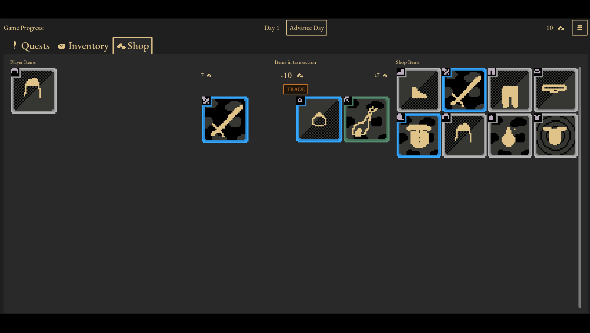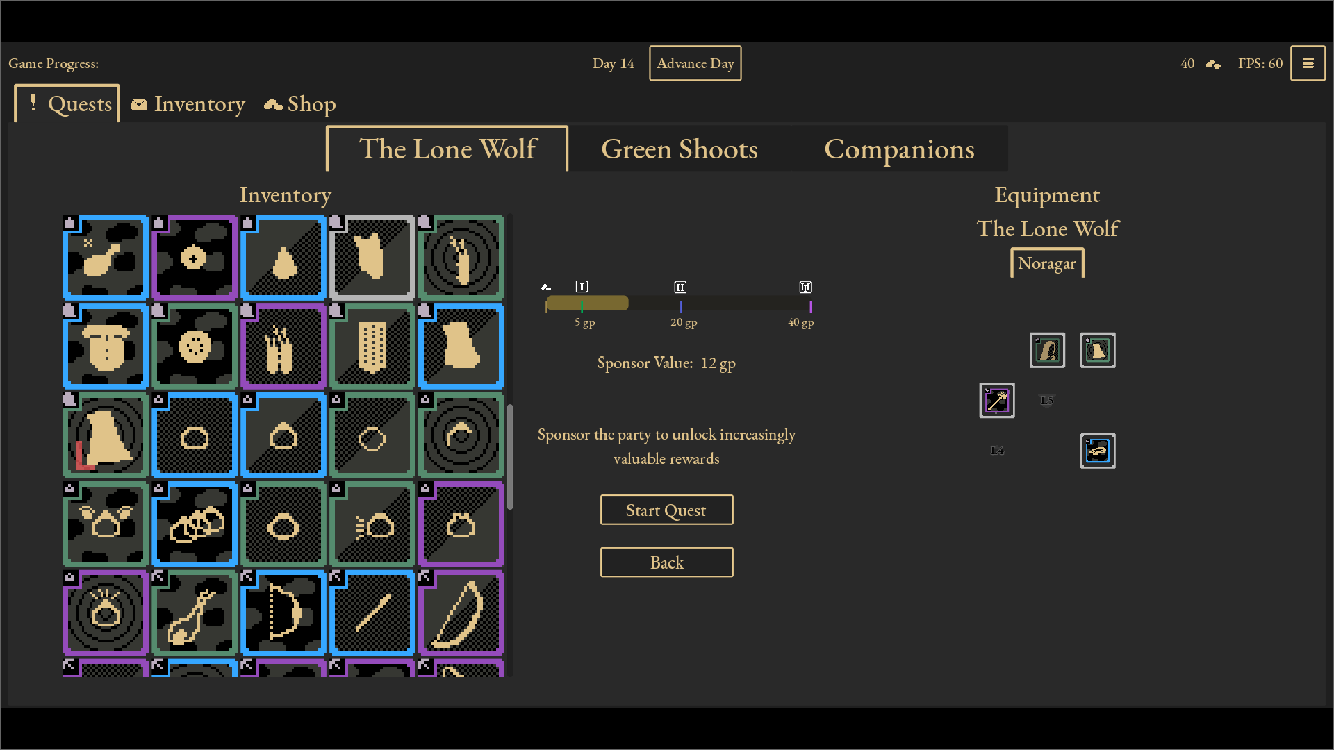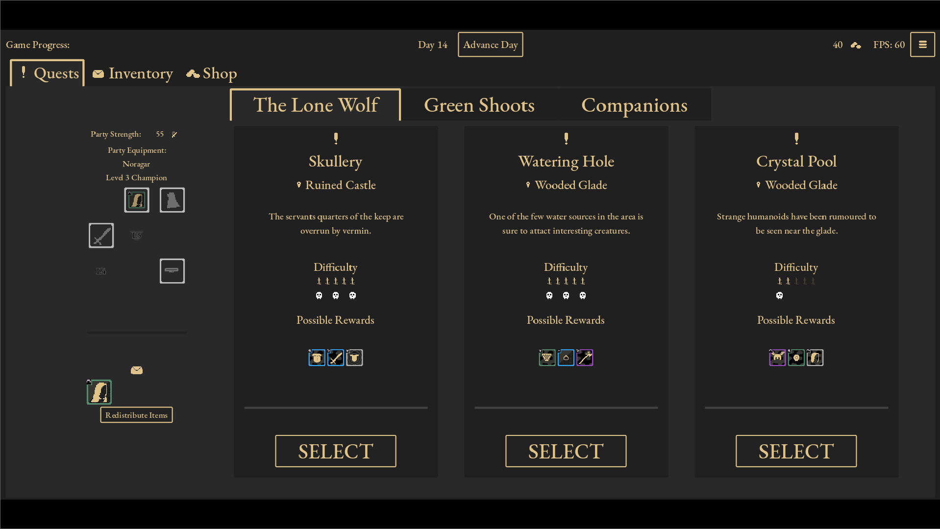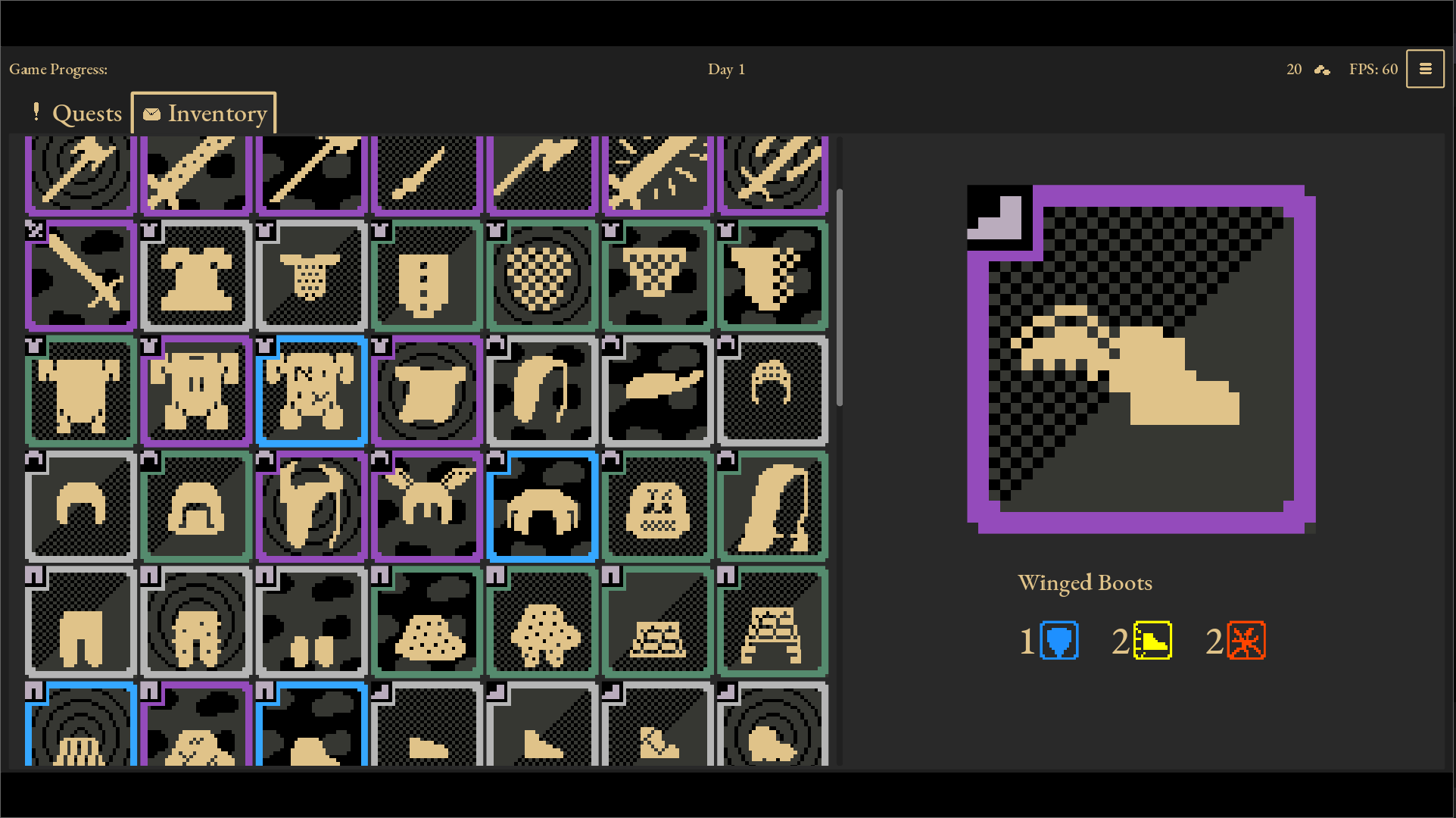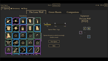 A couple of observations: 1) My first two playthroughs ended with starting champion dying in the first quest. As a first introduction, it seemed frustrating. I didnt understand hovering over the difficulty would show the possibility of success. Also, (small sample set) but it doesnt seem like there is an escape possibility where the quest isnt successful and the party still lives. 2) Is there a way to refresh quests? This is especially frustrating when all possible quests have a 7% or 0% or very low chance of success. Also, there were times when there were only two available quests after one had been completed. 3) Do more parties show up periodically when there is a slot open? I hadnt seen that and had progressed ~30+ days from when the party died. 4) When assigning equipment to each character after accepting a quest, there is no indication what class each character is. Having to switch back and forth from the party members screen to the inventory screen could be streamlined. Also, the order of characters in the party screen and the equip screen for quests is different. 5) Several of the final screens for the quest returned <null> and I'm not sure if that's because there was no fight data but it didn't provide much info to the player. 6) It would be helpful to be able to organize the inventory either by slot, etc. or to be able to equip the party somehow so I dont have to reallocate items each time... this would provide visibility into the progression, what items I should sell, etc.